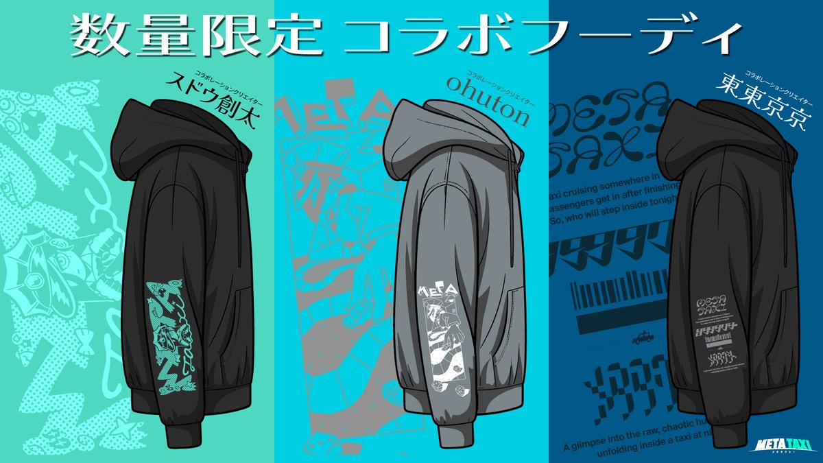 気鋭のクリエイター陣3組とのコラボフーディを限定販売限定グッズのコラボレーションクリエイターは◇スドウ創太( @sota_96 )◇ohuton( @nyr50ml )◇東東京京( @to2kyo2 )コラボフーディの販売だけでなく通常グッズやAWのグッズも販売します!